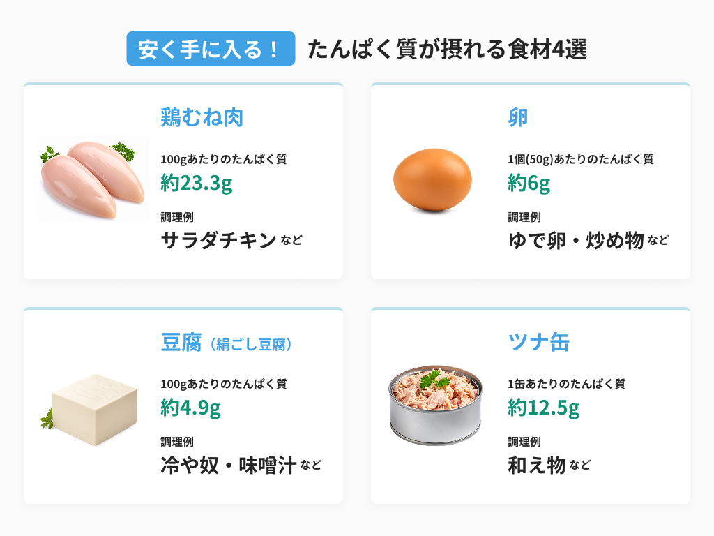 この記事では、栄養価・価格・手軽さのバランスが取れた、入手しやすいタンパク質食品を4つ紹介し、それぞれのコスパや栄養についても補足します。